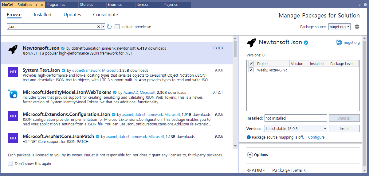 Installed 탭이 기본으로 열릴텐데, Browse 탭으로 이동해서 json 검색 후 Newtonsoft_json을 원하는 프로젝트에 설치해준다.