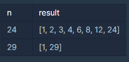 정수 n이 매개변수로 주어질 때, n의 약수를 오름차순으로 담은 배열을 return하도록 solution 함수를 완성해주세요.