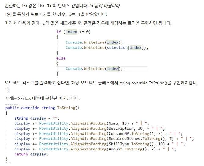 Console.WriteLine("원하는 항목을 선택한 후 Enter를 누르거나 Esc를 눌러 이전 화면으로 이동합니다.");