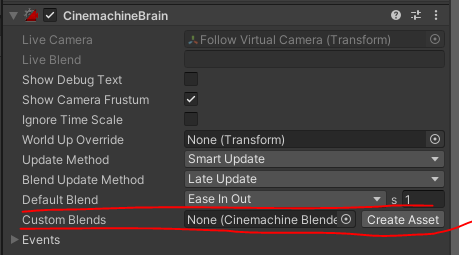 CinemachineBrain에서 Default Blend 혹은 Custom Blends를 통해 전환 효과를 변경할 수 도 있다.