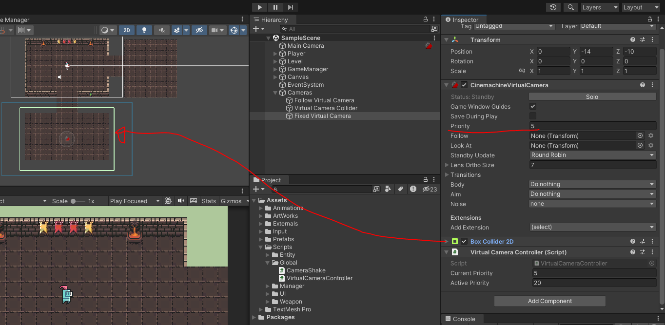 스크립트(VirtualCameraController.cs)를 생성하여 OnTriggerEnter2D 이벤트가 Player에 의해 발생할 때 virtualCamera의 Priority 값을 높게 설정하여 카메라를 전환한다.