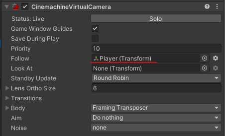 Cinemachine Virtual Camera 컴포넌트의 Follow 슬롯에 Player 오브젝트를 연결한다.