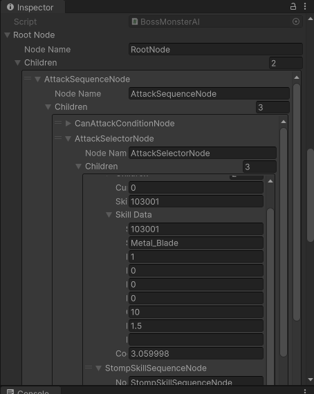 여기의 스킬 데이터를 불러와서 보스몬스터 AI에서 BT를 생성하고 하위 자식들에게 넣어줄때 데이터가 옮게 불러와진 모습!