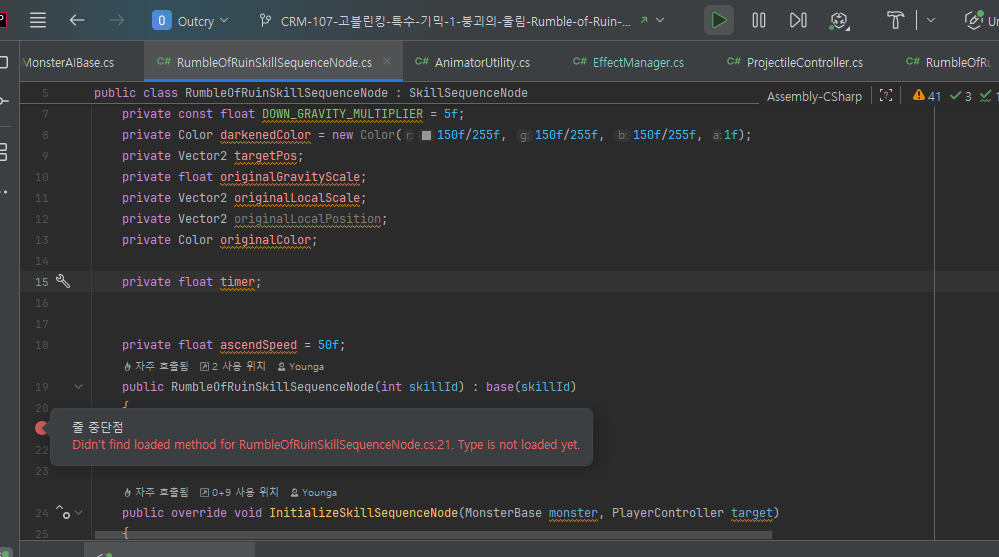 위와 같이 줄 중단점에서 Didn't find loaded method for ~~ 라는 말이 나온다.