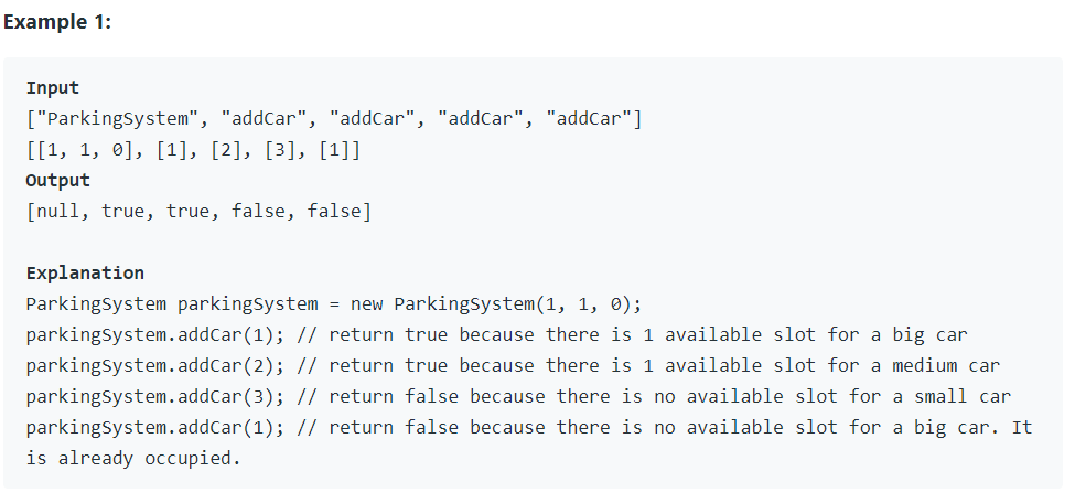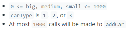 - bool addCar(int carType) Checks whether there is a parking space of carType for the car that wants to get into the parking lot. carType can be of three kinds: big, medium, or small, which are represented by 1, 2, 3 respectibely. A car can only part in a parking space of its carType. If there is no space available, return false, else park the car in that size space and return true.