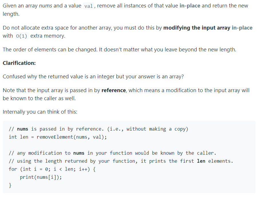 즉, 첫번째 예제 nums = [3, 2, 2, 3], val = 3 이었을 경우 nums는 [2, 2, ?, ?]가 되어야하고, 2를 리턴하면 된다. ?로 표시된 곳은 어떤 숫자가 들어가든 무시한다.
